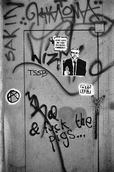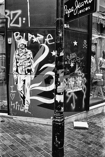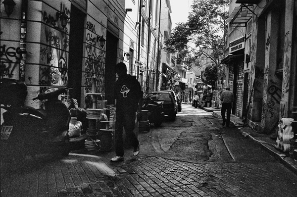 One guy begging at Athinas street misses his left lower leg, there’s an old woman begging in a wheelchair, a young man prays in despair. There are East-European drunkards and there are drug runners close to Monastiraki station and this one wears a T-shirt with a magic mushroom printed upfront. His face however stays invisible [how did you do that, you funky hip slinging photographer? Answer: no idea, pure coincidence]. An Asian pimp looks cool and his hookers go high heeled to work. Shops and offices are shut down near Omonia square and a closed door shouts out loud “Kill the Cops”. “Anarchism is Freedom” it writes on the marble walls of Athens’ 19th century Academia building. “Wake the Fuck Up” graffiti tells some Athenians next to an office of the recently deceased First Business Bank and a woman passes by a beggar at an office of the National Bank of Greece, ignoring him completely. The city of Athens and it’s people are torn. In summertime the city is burning hot as always, but the atmosphere is chilly and stoic.